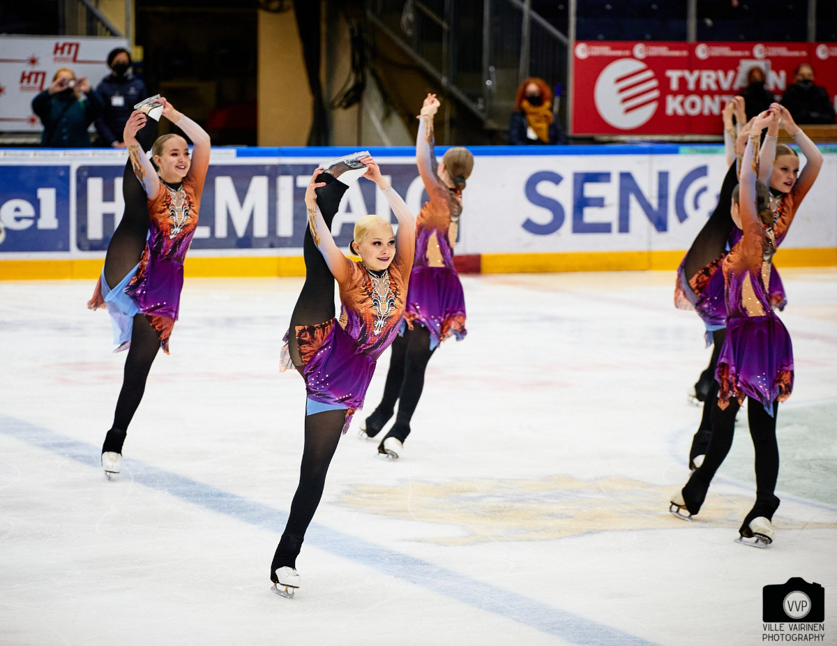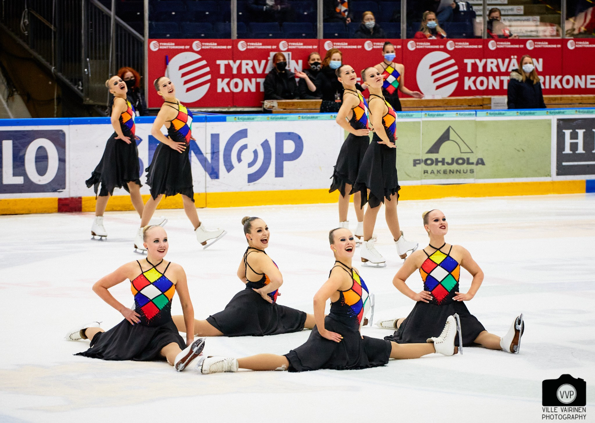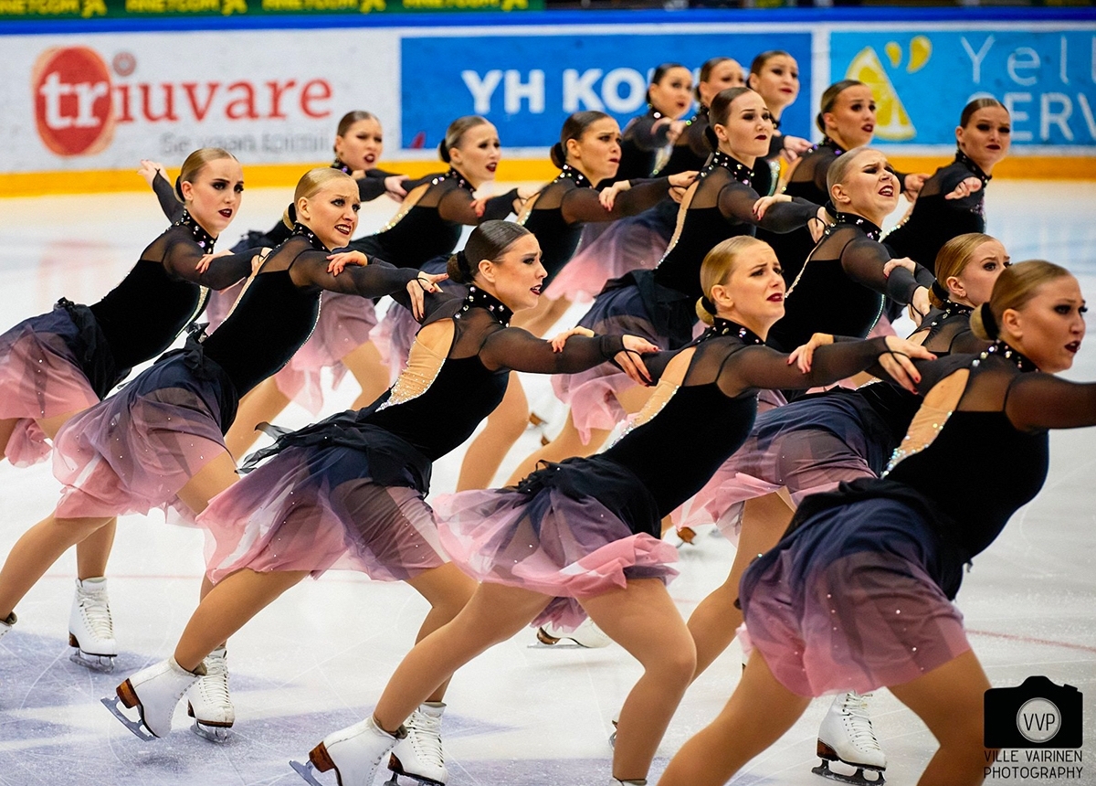 Helsinki Rockettes (HTK) started the senior competition and won the short program event with a total score of 73.10 points. Their program “Loneliness” was skated with softness and emotion.