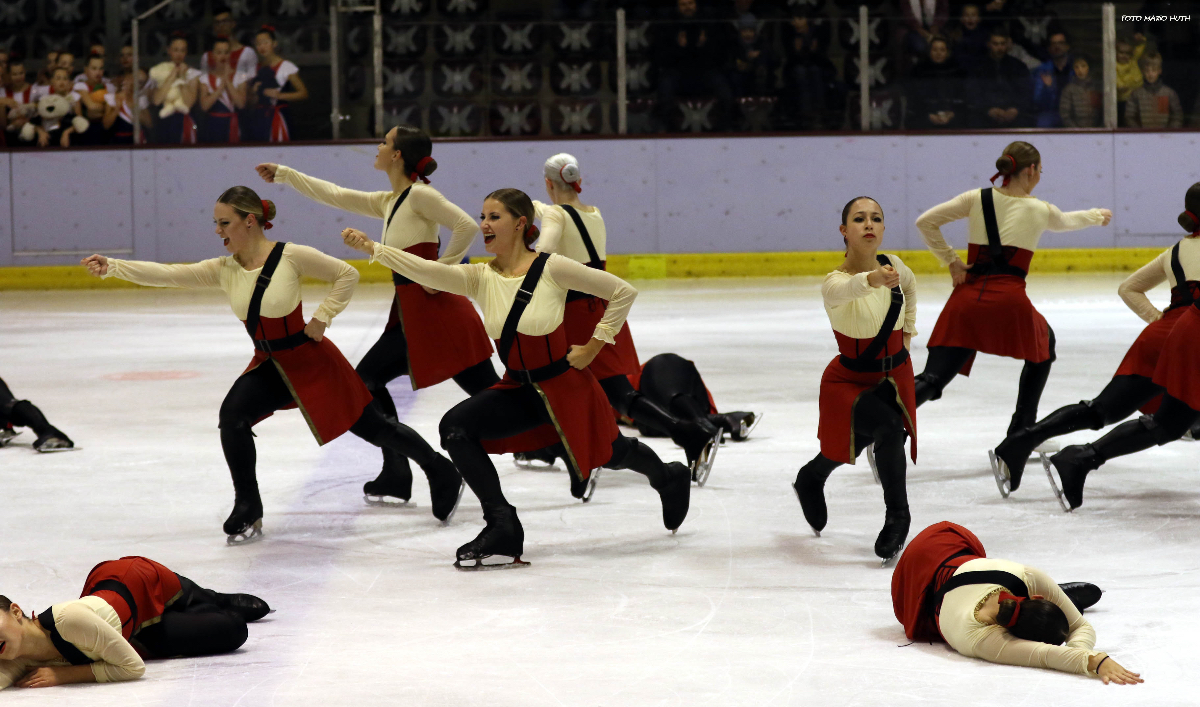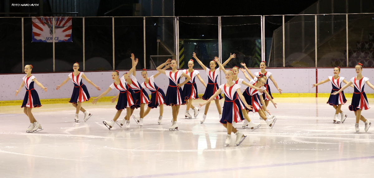 Skating to "Dumbo", Team Berlin Novice was the only team in their category. The team performed a clean program and earned a total of 47.99. Starting with a strong Pivoting Block, the team had more difficulties with the Move Element. Their new blue red and white dresses remember well the world of circus.