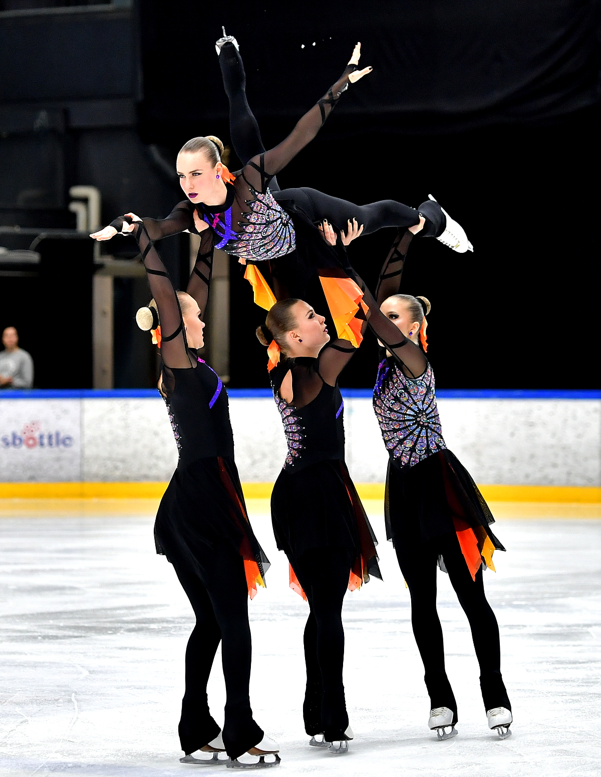 Team Skyliners (USA) performed a great program with no major error to motivating pieces of music. At the end, the audience enjoyed when the only man of the team was lifted by the girls. The skaters seemed happy with their performance and got 142.03 points for the free, and 210.04 overall.