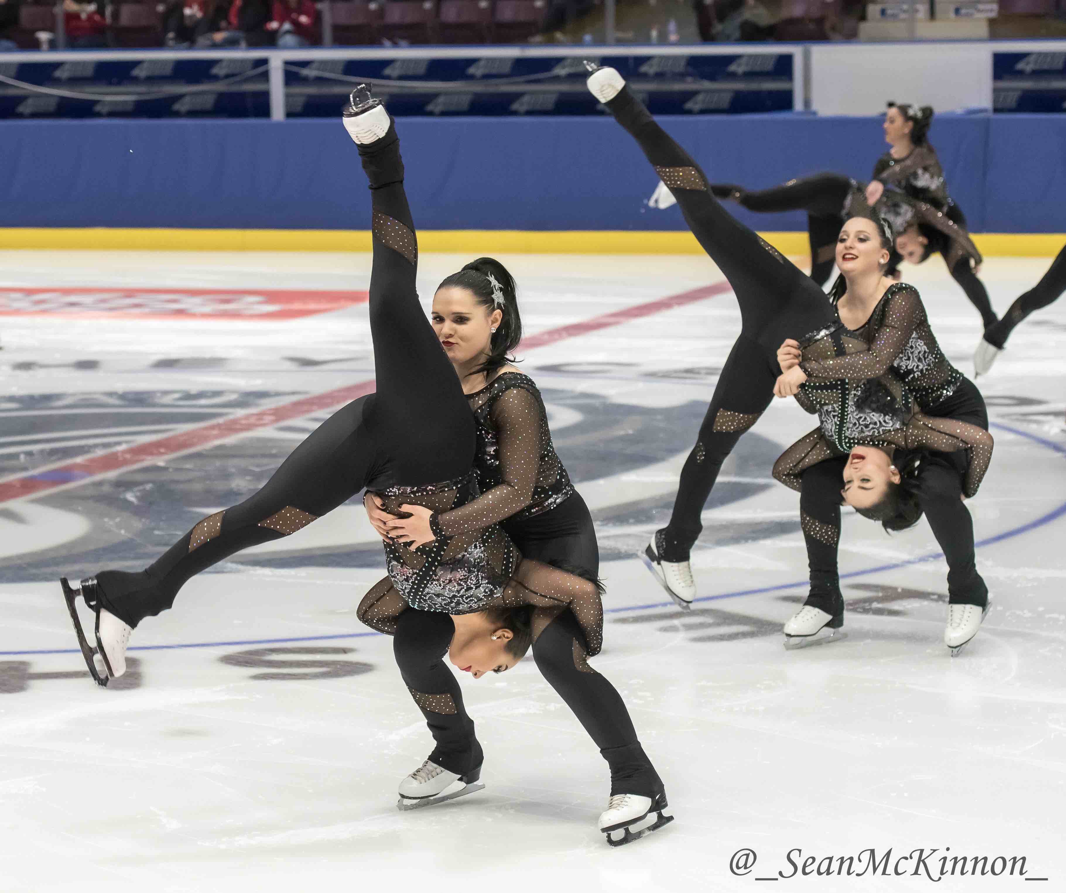 The senior free program was next, Nexxice took gold with their unique free program entitled “Rhythm Blues featuring Leon Bridges: Take Me To Your River. The team highlighted four skaters in the darkest blue colour, while all other skaters wore different shades of blue, to represent a body of water. Choreographer Shae Zukiwsky chose to have a series of different necklines on the dresses, to best suit each body type on the team, with the goal of making synchro more individualized in appearance.