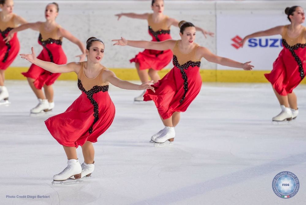 rnL’équipe d’Italie nous a offert une performance de qualité sur « Je me Souviens de nous », de Maxime Rodriguez chanté en francais. L’intensité de la musique était soulignée par la bonne glisse des patineuses. À leur sortie de glace, les filles ne semblaient pas satisfaites de leur performance (40,34 points).