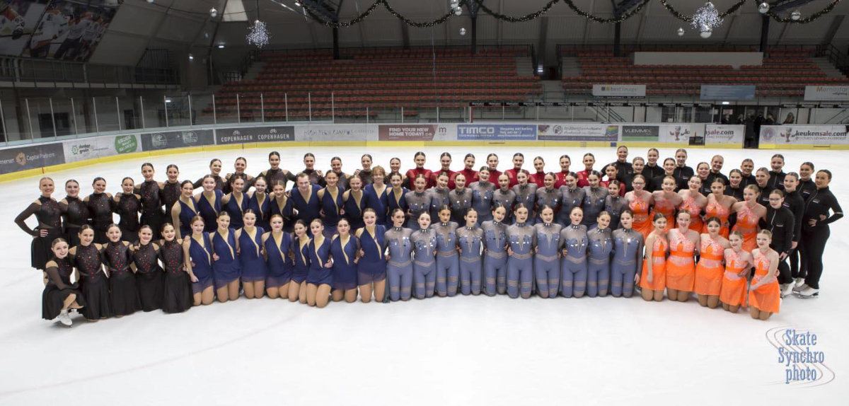Team Phoenix (Sen), Team Illuminettes 1 (Jun), Ice Fire (Sen), Ice Fire (Jun), Team Illumination (Sen) and Team Illuminettes 2 (Jun B) in Eindhoven after their Free Programs. (Credits: Skate Synchro Photo - 2021)