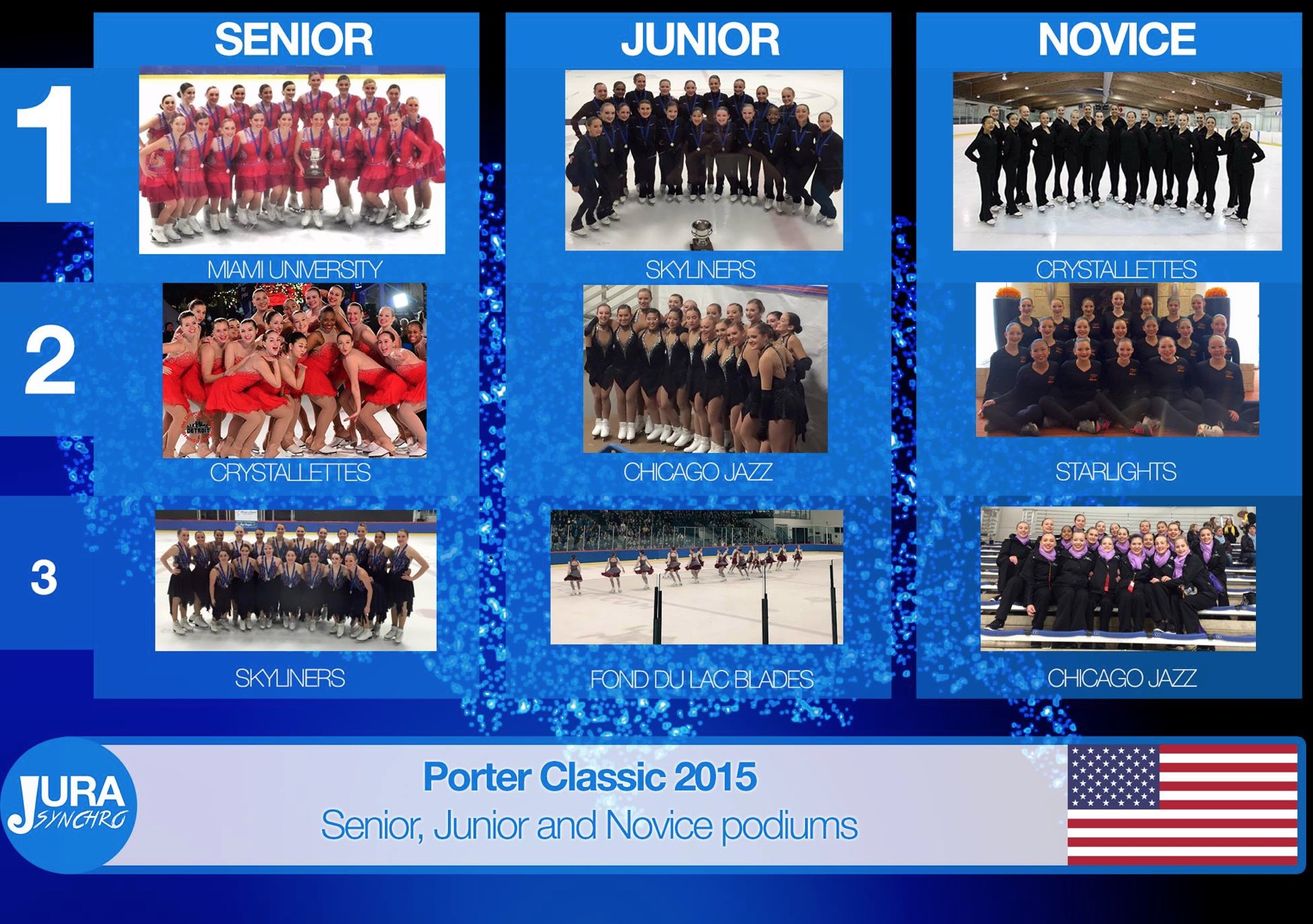 In the Novice division, Crystallettes won the competition on Saturday afternoon. These skaters already did a good performance a few days ago in the last Kalamazoo Kick-Off 2015. Crystallettes are followed by the 2014 Porter Classic Novice's winner: Skyliners, representing the Skating Club of New York and Springdale Figure Skating Club. The Chicago Jazz team took the 3rd place.
